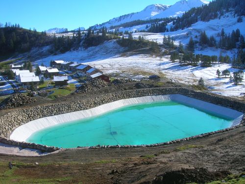 Neubau Speichersee Teufböni, Stoos, Neubau Beschneiungssystem am Klingenstock, Erstellung Lawinendamm, Grundablass für eine Schnellentleerung in 12 Stunden dimensioniert, Entnahmebauwerk und Pumpenhaus für Einspeisung in Beschneiungssystem.