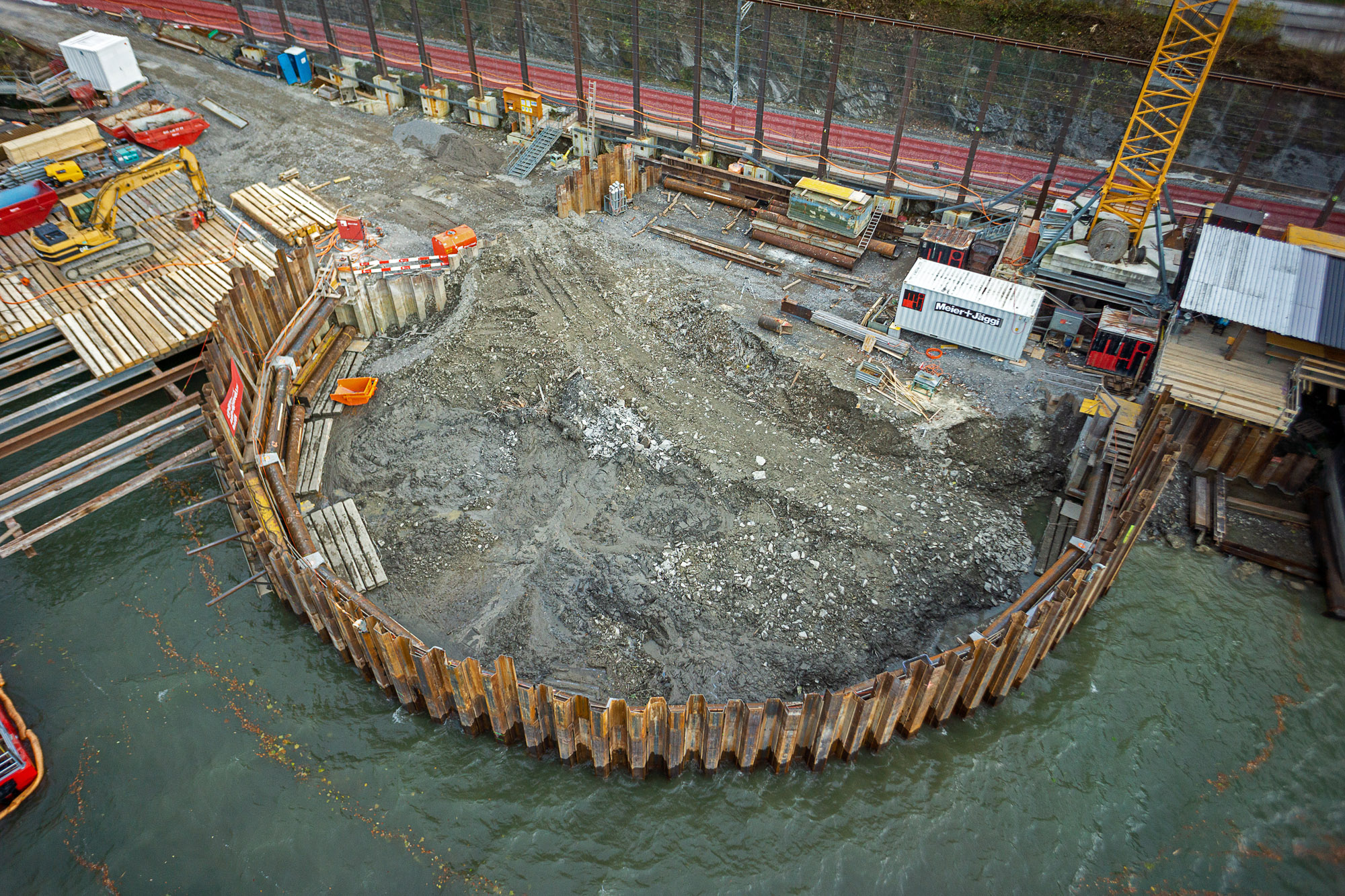Unterirdische Einstellhalle im Grundwasser. Hoch komplexe Baugrube mit artesisch gespanntem Grundwasserspiegel und geringmächtiger Sperrschicht. Regulierung unteres Grundwasservorkommen mit Filterbrunnen und detaillierter Überwachung. Baugrubenabschluss mit Spundwänden, teilweise gespriesst.
