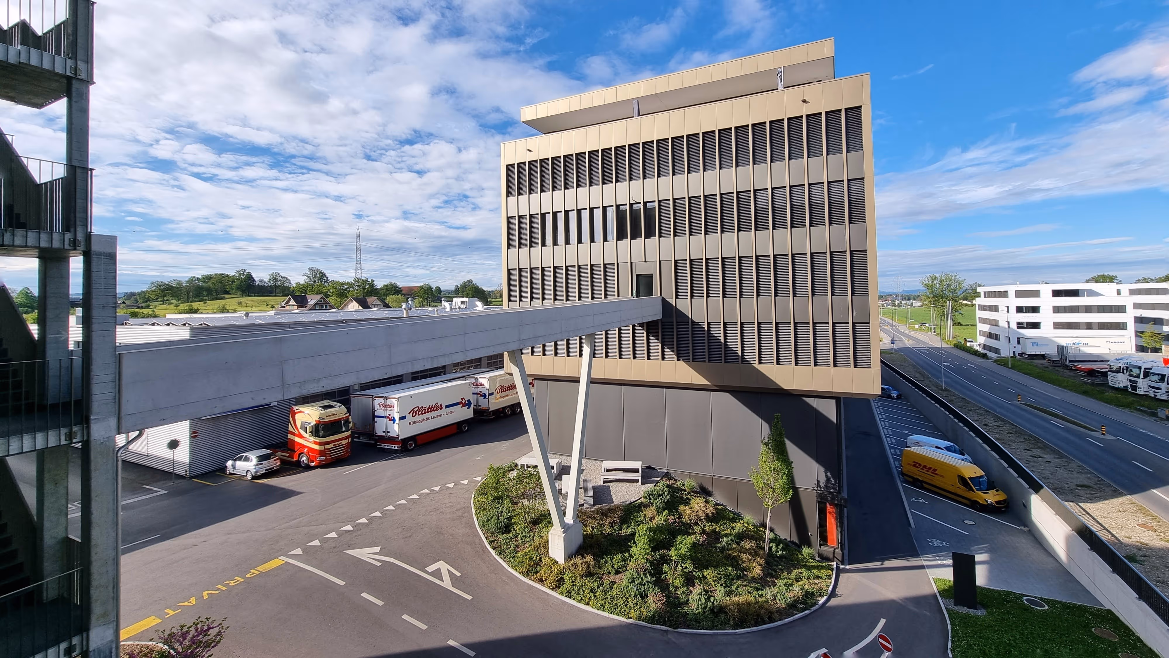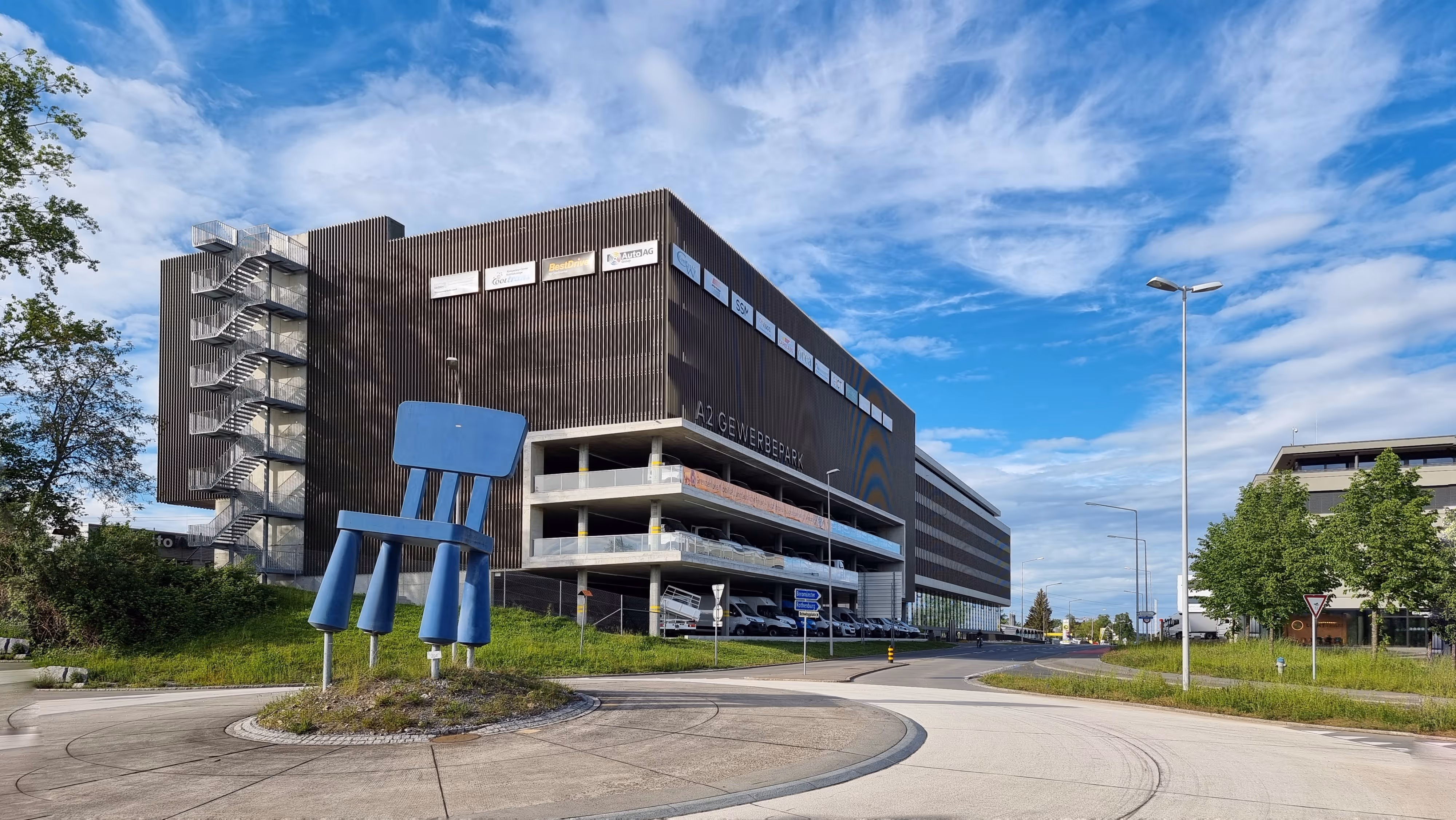 Der A2 Gewerbepark befindet sich auf der rund 40‘000 m2 grossen Parzelle 1948 in Rothenburg und ist Bestandteil des Gewerbezentrums der Auto AG Immobilien. Im repräsentativen Gewerbegebäude stehen total 10‘000 m2 für Büro-, Ausstellungs- und Gewerbeflächen zur Verfügung. Das zugehörige 6-geschossige Parking beinhaltet 324 Parkplätze und ist über eine Fussgängerbrücke mit dem Gewerbegebäude verbunden. Die Tragwerke beider Gebäude sind in Stahlbeton-Skelettbauweise ausgeführt, welche sämtliche Anforderungen an die Wirtschaftlichkeit und Flexibilität der Bauherrschaft erfüllen. Damit die Gelenkbusse mit genügendem Wendekreis in die benachbarte Halle einbiegen können, ragt das Parking über die entsprechende Verkehrsfläche. Die auskragenden Parkdecks sind mittels Stützenvorspannung an den massiven Dachträgern aufgehängt. Durch die aktive Krafteinleitung werden die Verformungen der schlanken Flachdecken auf ein gebrauchstaugliches Mass begrenzt.