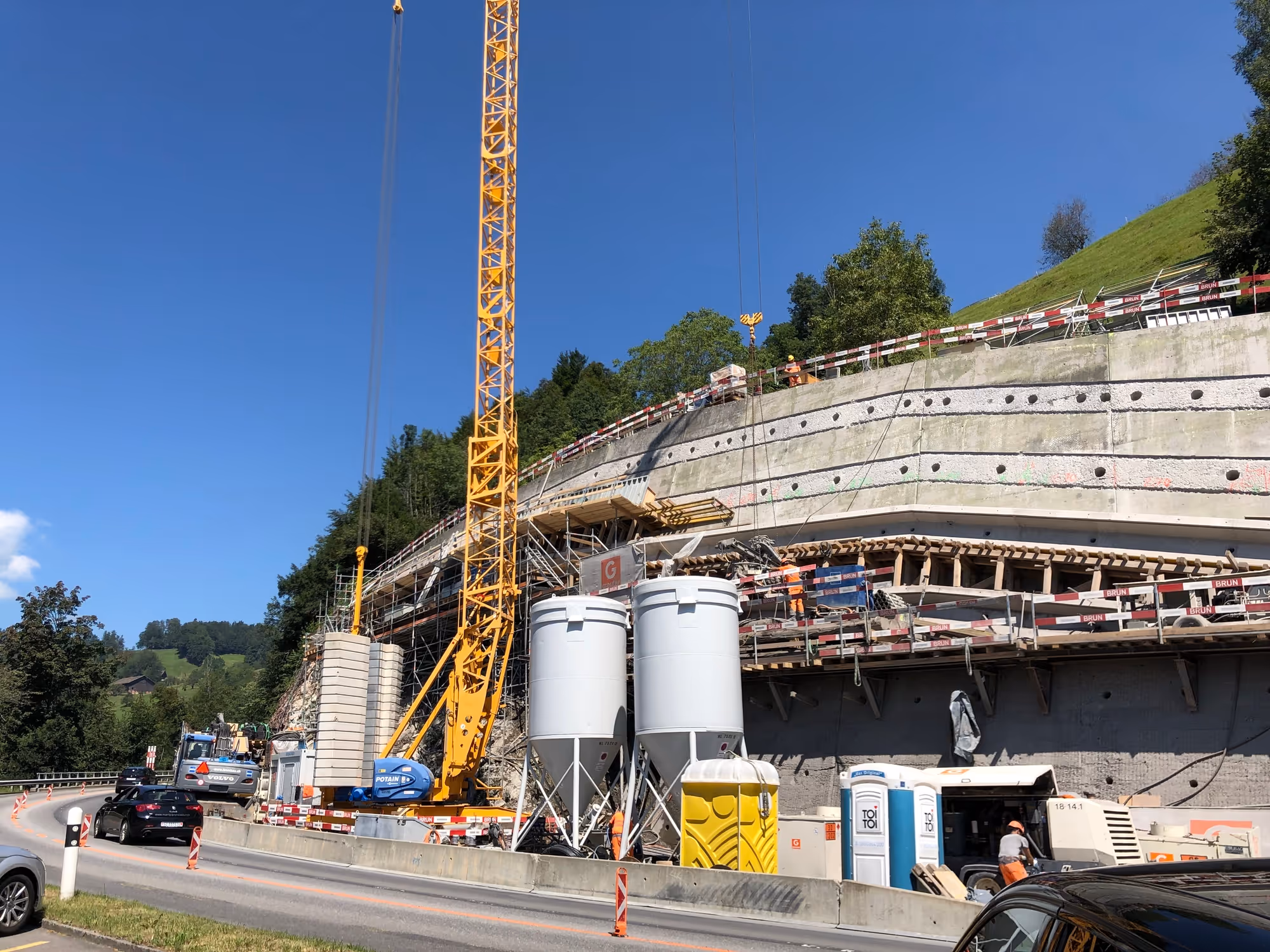 Die Arbeiten an der talseitig verankerten Bohrpfahlwand Spiegelberg zwischen Schwyz und Sattel konnten Ende September fristgerecht abgeschlossen werden. Es wurde eine Longarine mit 15 vorgespannten Ankern erstellt. Der Verkehr auf der vielbefahrenen Hauptstrasse Schwyz – Sattel konnte immer zweispurig geführt werden.